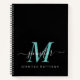 Black White Teal Blue Elegant Personalised Journal Notebook with Your Name in Hand Lettered Script Font and Modern Typography with Bold Monogram Initial. Elke Clarke© Add you name or monogram or text using the customise menu.