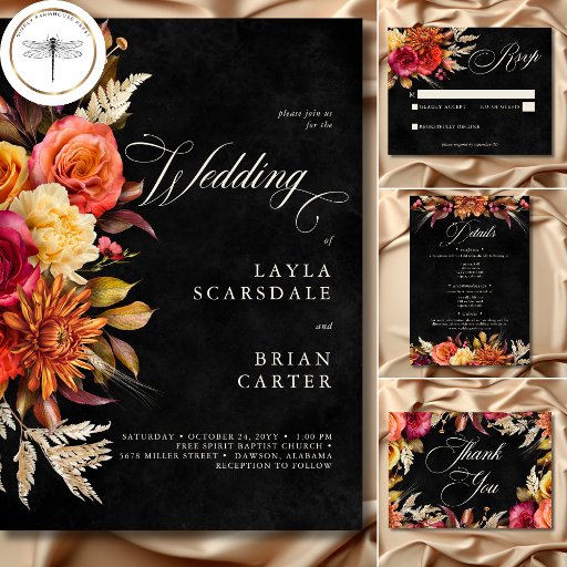 Step into a realm of exquisite elegance with our boho floral dark and moody wedding invitation. Designed to captivate the senses, this invitation boasts a striking black background adorned with a breathtaking burst of vibrant florals in deep burgundy, magenta, orange, gold, and creamy hues, complemented by lush olive green foliage and boho dried botanicals. The creamy elegant script text delicately adds a touch of romance to the overall allure. Embrace the opulence of the rich tones and set the tone for your special day with this stunning invitation, sure to leave a lasting impression on your guests. Created by Simply Farmhouse Press.