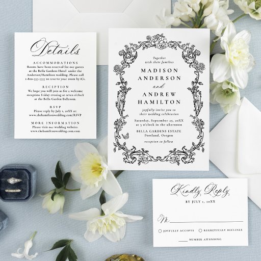 Set a timeless tone for your wedding reception with these Elegant Black Victorian Floral Table Number Cards. “Table” is displayed in graceful calligraphy, with the table number, couple’s names, and wedding date shown below in refined serif lettering. An ornate frame of roses, leaves, and baroque-inspired scrollwork surrounds the design, creating a classic, heirloom look perfect for formal and traditional celebrations. This card measures 3.5"x5". Edit each table number individually and add them to your cart to ensure a smooth ordering process.