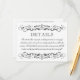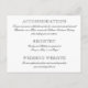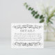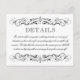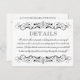 Custom Details Card in black and white colours with elegant vintage flourish details. Includes information for an adults-only wedding reception on the front with additional information for hotel accommodations, registry, and wedding website on the back. Card wording and colours and be completely personalised.