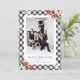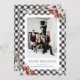 Elegant black and white photo Happy Holidays card featuring snowflakes on a black and white buffalo plaid background adorned with watercolor painting of white poinsettia, conifer tree branches, holly and red berries. Easily personalize this business photo holiday card with your photo and company name.