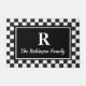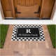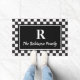 Elegant custom monogram doormat in classic chequered black and white colours pattern . You can personalise with your family's last name in script and a serif style monogram initial.