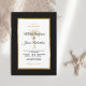 Invite your guests to help you celebrate your special day with this elegant invitation featuring modern script, black and gold text including an artistic palm tree and metallic gold foil frame on the front of the card. A black background is on the front and back.