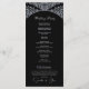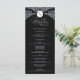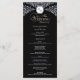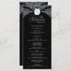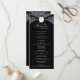 This wedding program features a bold black background framed with ornate white damask flourishes, giving it a formal and timeless style. At the top, a decorative crest displays the initials, while the centre of the design presents the couple’s names and all wedding service details in a clean, organised layout. The contrast of black and white creates a striking look that emphasises elegance and sophistication, making it a perfect choice for traditional or evening weddings.