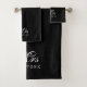 Elegant Black & White Mrs Name Bath Towel Set. Features beautiful scripty Mrs text and customisable name in white on black. Gorgeous gift for self, newly weds, couples, great for anniversaries, wedding presents, new home, renovation presents, and other special occasions. We invite you to visit our Zazzle store, GJ Design Co, to view matching products and more.