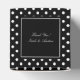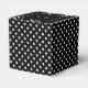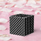 Personalised wedding favour boxes. Elegant black and white polka dots pattern design. Cute gift idea for guests. Custom background colour with white polkadots. Add your own thank you message with name of bride and groom on top. Small size box for candy and little trinklets. Fancy script print for classy marriage couple.