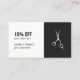 Elegant modern fully customisable referral card for hair salon. Simple design whit black and white colours/ faux silver scissors icon.