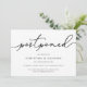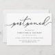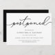 Need to postpone your wedding or change the date? Let guests know with these simple and elegant wedding postponement announcement cards. Chic black and white design features "postponed" at the top in hand lettered calligraphy script, with your names and new date beneath. Adjust the wording and level of detail as needed. As shown, sample text directs guests to your wedding website for additional information.