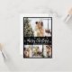 Elegant, Modern 4 Photo Collage Black and White Merry Christmas Script Holiday Card. This festive, minimalist, whimsical, (4) four photo holiday card template features a pretty photo collage, some small snowflake and says Merry Christmas! The „Merry Christmas” greeting text is written in a beautiful white colour hand lettered typography font type on black colour background. On the reverse side with greeting text template on black. Pretty greeting card for your family and friends in this Christmas and Holiday season.