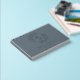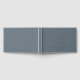 Custom-designed steel blue and silver foil wedding guestbook featuring modern elegant foliage wreath monogram with personalised couple's initials, name, and wedding date.