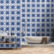 Easy to install peel and stick wallpaper with blue and white floral Mediterranean tile pattern inspired by Portuguese Azulejo, featuring an original illustration of elegant nature motifs. With its modern yet classic design with intricate details, this wallpaper is perfect for bathroom, kitchen, living or dining room wall. Bring timeless sophistication to your home interior design with this stunning tile patterned wallpaper, effortlessly blending tradition with a contemporary flair, creating a stylish and inviting living space.