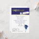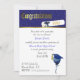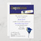 Elegant graduation party invitation, done with a white background and graphics of a festive blue and gold balloon, with a mortarboard cap on it, in the lower right corner of the invitation. A pretty blue floral damask pattern, across the top, has gold tone graphic text reading Congratulations and a diploma scroll has gold tone custom text reading the year. Personalise the year and rest of the invitation's text to suit your party needs.