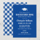 Invite friends and family with this blue graduation party invitation featuring a bold “Backyard BBQ” headline, graduation cap icon, and clean rustic typography. Perfect for a casual cookout, open house, or summer backyard celebration. Backside features a coordinating royal blue and white gingham pattern for a classic picnic vibe. Personalise with your graduate’s name and party details.