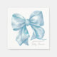 A charming cocktail napkin design featuring a large watercolor blue bow at a cute angle in the centre. The mum to be's name is displayed in a classic serif font in the lower right corner, with "Baby Shower" elegantly written below in handwritten script calligraphy.