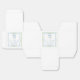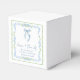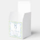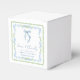 Elegant bridal shower party favor boxes featuring green scallop and blue floral watercolor frames, a delicate blue coquette bow watercolor, "love + thanks" showcased in an elegant blue calligraphy script, and the name of the bride and shower date in classic serif typography.