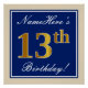 This simple and elegant birthday party poster design features a personalised message like "NameHere’s 13th Birthday!" (with the "13th" having a faux/imitation gold-like colouring look) within a blue-coloured square area featuring a simple border outline. The name is in an elegant white-coloured script-like text, and can be personalised. A personalised birthday party poster like this could perhaps be used as a decoration at a party being held for somebody who is celebrating their thirteenth birthday. [~Z0000239]