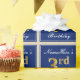 This simple and elegant wrapping paper design features a personalised message like "NameHere’s 3rd Birthday" (with the "3rd" having a faux/imitation gold-like colouring look) within a blue-coloured square area featuring a simple border outline. The name is in an elegant white-coloured script-like text, and can be personalised. Wrapping paper like this could perhaps be used when wrapping birthday gifts for somebody who is celebrating their third birthday. [~Z0000221]