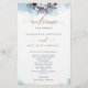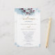 Elegant Wedding program with delicate blue watercolor stain background and top exquisite floral element with flowers and foliage in dusty blue, navy, burgundy, purple, magenta and red hues. Gold details in modern hand written calligraphy. Ability to make text changes and adjustments by selecting customise further. Front with wedding ceremony details, back with wedding party names and thank you message for your guests. Elegant and romantic modern feel. Part of our "Celestial Blooms"" collection with variety of coordinating products available.