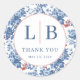 This elegant wedding sticker features a floral design with large blue roses and smaller red flowers, creating a lush, intricate tapestry. The central circular border highlights bold navy initials "L" and "B," accompanied by the phrase "THANK YOU" in a classic serif font, conveying gratitude and sophistication. The harmonious color palette of deep blues, vibrant reds, and lush greens enhances the naturalistic representation style, making it perfect for adding a touch of elegance to your special day.