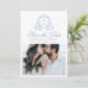 Announce your upcoming wedding in style with this classic blue photo save the date card. The front showcases your custom monogram initials inside a soft blue floral crest on a white background. Your names appear in elegant blue calligraphy, followed by your wedding date and location. A horizontal engagement photo beneath adds a personal, memorable touch. On the back, display a vertical engagement photo with a convenient QR code that guests can scan to access your wedding website and any custom instructions. A timeless and versatile choice, perfect for coastal weddings or classic celebrations.