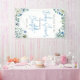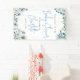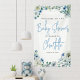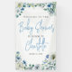 Cheerful white peony flowers and green watercolor leaves form a beautiful border on this pretty blue floral spring baby shower welcome vertical banner. A chic, modern handwritten script on garden brunch decor for a pregnant mom expecting a little boy.