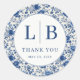 This Classic Round Sticker features a charming blue and white color palette, reminiscent of vintage porcelain designs. The intricate floral motifs create an elegant and timeless aesthetic, perfect for adding a touch of sophistication to any surface. With the initials "L B" prominently displayed in a stylish font, this sticker is ideal for personalizing gifts or expressing gratitude with its subtle "Thank You" message. Its classic design makes it suitable for various occasions, from weddings to baby showers, offering a versatile and heartfelt touch.