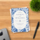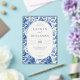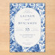This is a vintage style image featuring an elegant wedding invitation surrounded by intricate blue floral patterns. The design exudes sophistication and charm with its classic color palette of deep blues on a crisp white background, creating a timeless and romantic atmosphere. Perfect for setting the tone for a beautiful celebration, this invitation invites guests to join Lauren and Benjamin on their special day at Willowbrook Estate in Atlanta, Georgia.