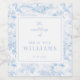 Elegant romantic classic blue chinoiserie porcelain inspired floral pattern wedding wine bottle labels with newlyweds last name.