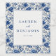 This elegant wedding wine label features a symmetrical layout with a central white square bordered by a delicate blue floral pattern. The design showcases large, detailed peonies in deep blue hues on a cream background, creating a classic and sophisticated look. Customizable text is presented in bold, uppercase serif fonts, adding a timeless quality to the overall aesthetic. Perfect for celebrating your special day, this label combines traditional botanical elements with modern typography, evoking a mood of celebration and refinement.