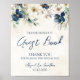 An elegant guest book sign for your winter wedding with navy blue and cream watercolor flowers and modern handwritten style text.