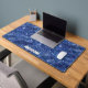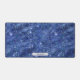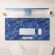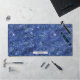 This attractive desk mat features an elegant blue and silver glittery gem abstract background. Your name or monogram is in dark blue at the centre of a silver banner at the bottom.