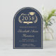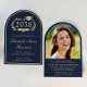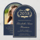 Elegant arch-shaped dark blue college graduation party invitation with "Class of" in a gold laurel wreath, a gold grad cap and diploma, the graduate's name in a gold calligraphy script, and their school, major, honours or future plans in classic gold serif typography. On the back, add a photo and personalise your party details.