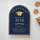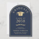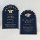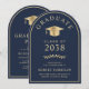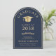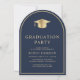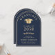 Elegant arch-shaped blue college graduation announcement and party invitation featuring a gold grad cap and classic gold serif typography for the graduate's name, class year, college or university, degree and major or honours. On the back, add your party details.