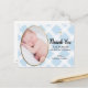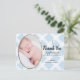 Personalise with your baby boy's photo and full name. This elegant baptism thank you card postcard makes it easier to send out your gratitude. Replace the photo using this editable template. White circle pattern on a blue background and a printed gold cross.
