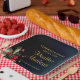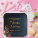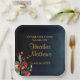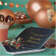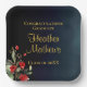Delicate, sophisticated and full of elegance graduation party plates with a simple, yet beautiful floral arrangement on the bottom left corner featuring gorgeous red flowers and complimented exquisite green botanicals. Elegant gold customisable typography for the event details on a midnight blue gradient for background.