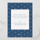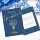 A simple but elegant dark blue Hanukkah flat card with "Happy Hanukkah" in gold foil complementary typography, which feature both a classic, bold block style font and a fanciful handwritten display font sweeping across the card. An elegant gold menorah is displayed below. The reverse side has a message to use or edit in a classic blue font and a place for family names. The background pattern is the Star of David in a abstract design. Click the personalise button to use the template fields to edit the reverse side of the card.