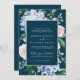 This elegant blue hydrangea navy formal wedding invitation is perfect for a spring or summer wedding. The classic floral design features soft powder blue watercolor hydrangeas accented with neutral blush pink flowers and green leaves.