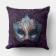An elegant blue masquerade mask features intricate swirling patterns and shimmering jewels, exuding a sense of mystery and sophistication. The design includes ornate embellishments, a purple damask background, and curling details that enhance its captivating appearance.