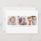 Announce your new baby boy or girl with this simply elegant photo birth announcement. The front features a full-bleed photo with a soft blue text overlay, spaced serif name typography, and a decorative calligraphic scroll flourish. The back includes three square photo placements and a personal message from the parents. All text and background colours are fully customisable.