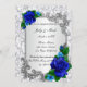 Pretty blue roses and silver leaf pattern frame. Surprise your friends and family with a charming engagement party invitation that blends classic style with fresh, modern details when you send this elegant invitation. This beautiful invitation card is all ready to be personalised. Personalise the card by changing the text in the fields provided front and back. You can change font style, size, and colour, as well as paper type and style.