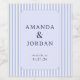 These elegant wedding wine labels feature a minimalist design with vertical stripes in soft pastel blues and whites, creating a serene and sophisticated atmosphere. The centred rectangular frame highlights the names "Amanda & Jordan" in bold serif typography, complemented by smaller sans-serif text for location and date details. The clean layout and modern style make these labels perfect for celebrating your special day with a touch of understated elegance. Ideal for weddings or romantic events, they offer customisable options to personalise your celebration effortlessly.
