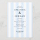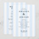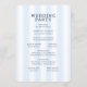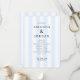 This wedding program features a modern, minimalist design with a light blue background adorned by vertical white stripes. The elegant navy blue text is arranged in a clear hierarchy, highlighting the ceremony details and names prominently. With clean lines and ample negative space, this design exudes sophistication and tranquillity, perfect for a formal wedding celebration. Its straightforward layout ensures readability while maintaining an inviting and serene mood.