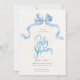 This elegant baby shower invitation features a soft blue watercolor bow paired with clean, timeless typography for a refined and welcoming look. Designed to suit baby boy or neutral baby shower themes, this invitation balances classic charm with modern simplicity.