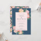 This elegant wedding invitation suite features a stunning watercolor floral design in soft tones of beige, light yellow, blush pink and orange, set against a beautiful mid-dark blue background.
