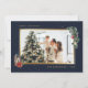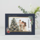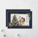 Elegant custom watercolor photo Christmas cards featuring a dark blue photo frame decorated with watercolor illustrations of poinsettia, lantern, and ornaments on a pine tree branch with pine cones. Easily personalise these elegant watercolor Christmas photo cards with your image and text.
