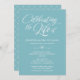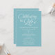Memorial service invitation in a soft shade of blue with elegant white text. Celebrating the life of is written in a lovely calligraphy font.