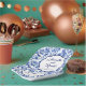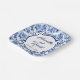 A wedding plate featuring an elegant blue and white floral toile design.