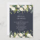 This beautiful, romantic white floral greenery watercolor bridal shower invitation features a sumptuous greenery drop at the top comprised of a bountiful collection of eucalyptus greenery and white roses, hydrangeas, and other white flowers. A similar arrangement is placed at the bottom of the design, and elegant modern style invitation text personalises the design in the middle, with elegant white type on a modern navy blue texture. Copyright Elegant Invites, all rights reserved.