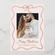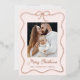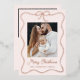 Celebrate the season with our Elegant Blush and Rose Gold Foil Ribbon Bow 2 Photo Holiday Card. This charming design showcases your cherished family photo surrounded by a festive rose gold foil ribbon frame, complete with a bow at the top. The blush background beautifully highlights the handwritten "Merry Christmas" greeting in rose gold foil script, which can be customised with a greeting of your choice. Add your family name for a personal touch. The back features space for a second photo and a heartfelt message. Perfect for sharing joy with loved ones this holiday season!