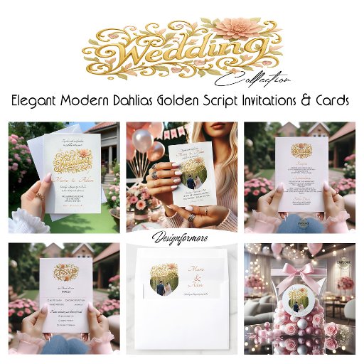 Elegant Blush Dahlias Golden Script Wedding Invitation